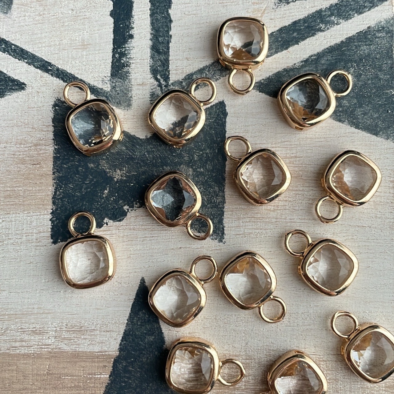 多面カットのガラスにゴールドのフレームが映えるスクエア形チャーム。