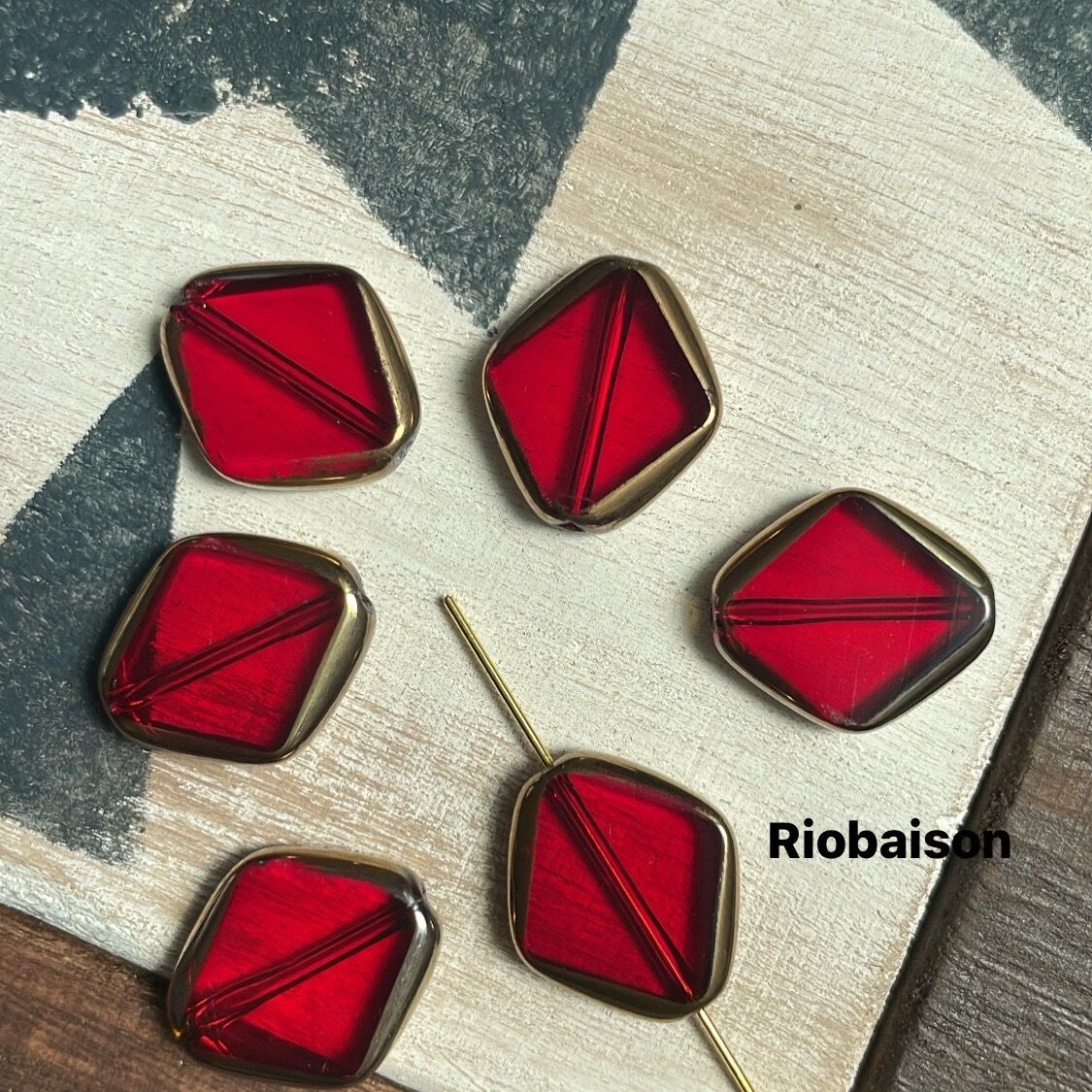 菱形のガラスビーズにゴールドの縁取りが入った、個性的なデザイン。