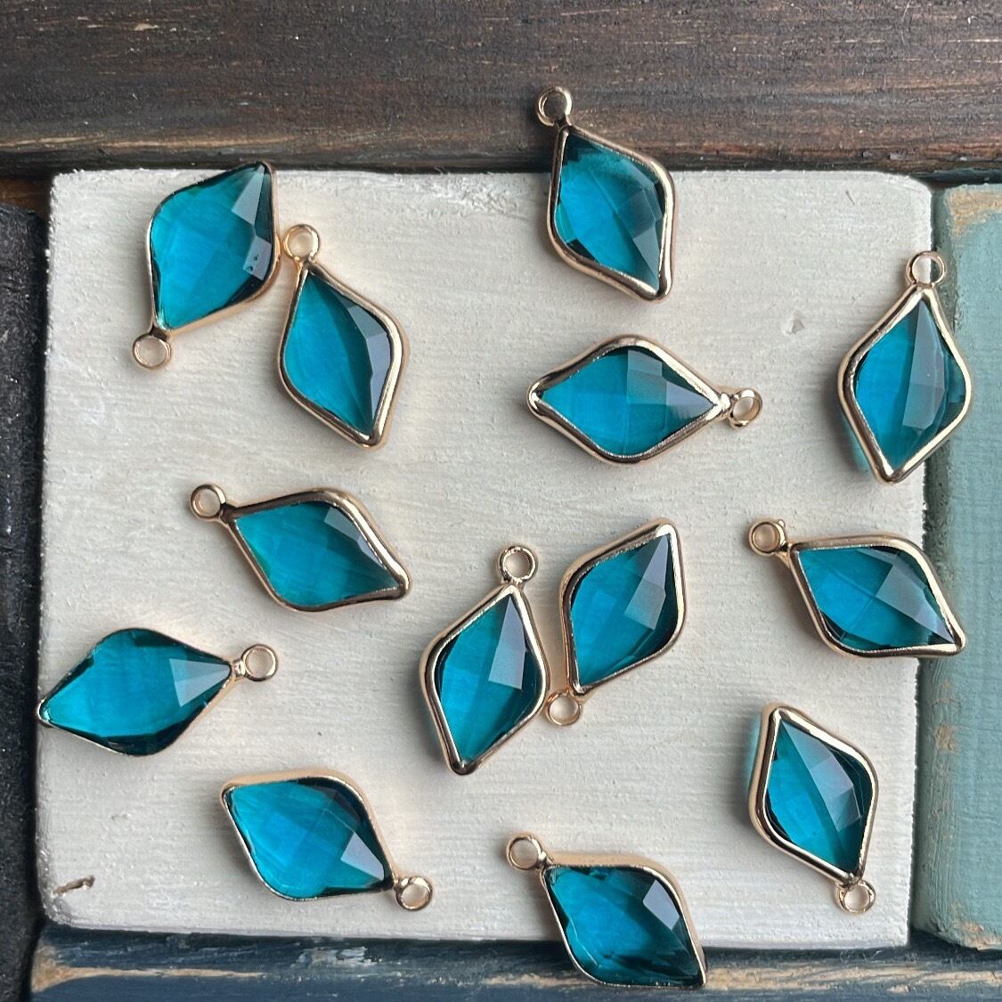 クリスタルガラスダイヤ形ゴールドフレームチャーム(ブルーグリーン)3個